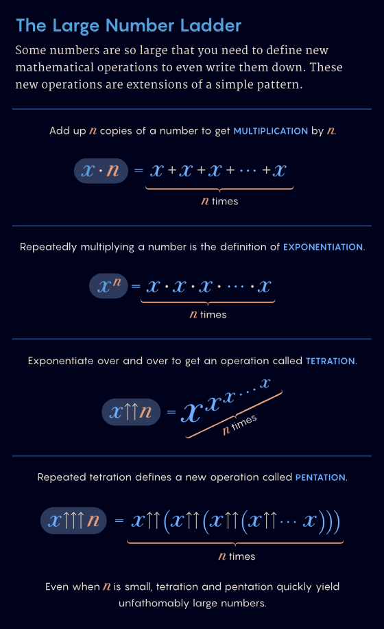 如果说上一个记录勉强还能使用「超乘」作为数学符号来表达,那这个全新量级的新纪录甚至必须再次引入一个全新的数学符号:五乘(pentation)。