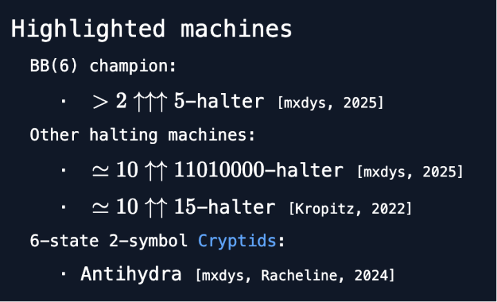 自从完成BB(5)的证明后,神秘的mxdys就不断向BB(6)发起挑战。他采用复杂的自动化方法,将几乎所有候选图灵机分类处理,只剩下几千台待定的图灵机。