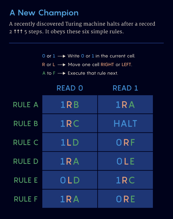 当Ligocki第二次超越Kropitz时,他找到了一台六规则图灵机,在停机前竟然跑了超过10↑↑5步。很快,Kropitz就以更惊人的成果回应:一台能运行10↑↑15步的机器——相当于一座高达15层的10的幂塔。到此为止,他们已经彻底告别了人类习惯理解的数字世界。