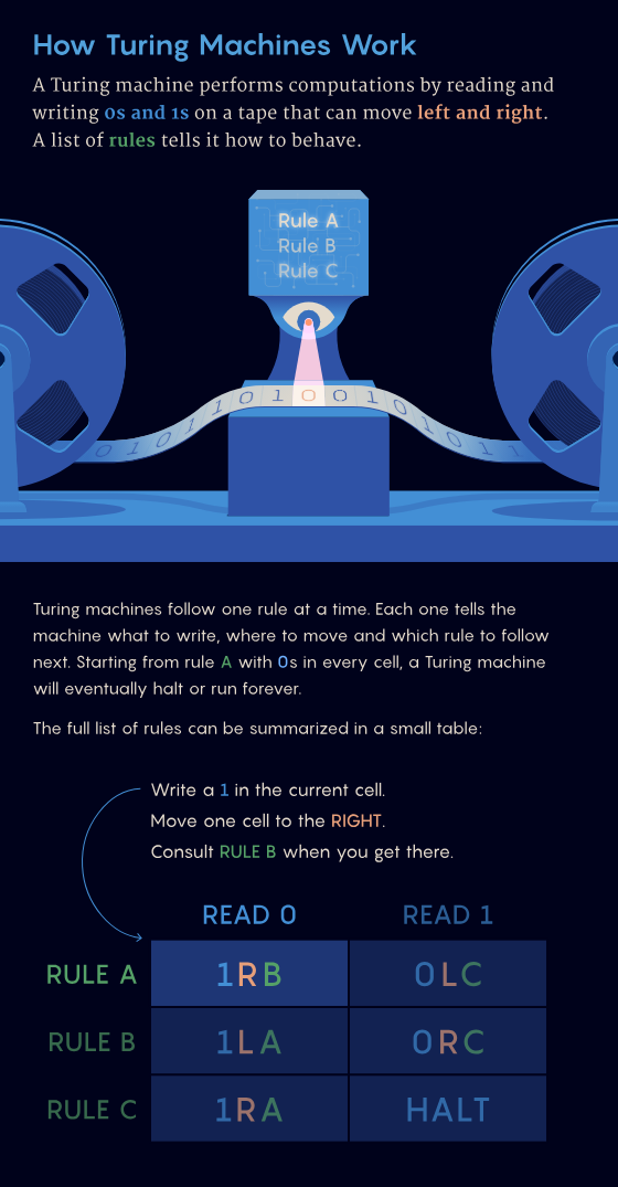 每一台图灵机都依据一份独特的「规则清单」,一步步地执行计算。规则看似简单,但数量越多,机器的行为就会变得越复杂,也就越难判断它究竟会不会停下来。